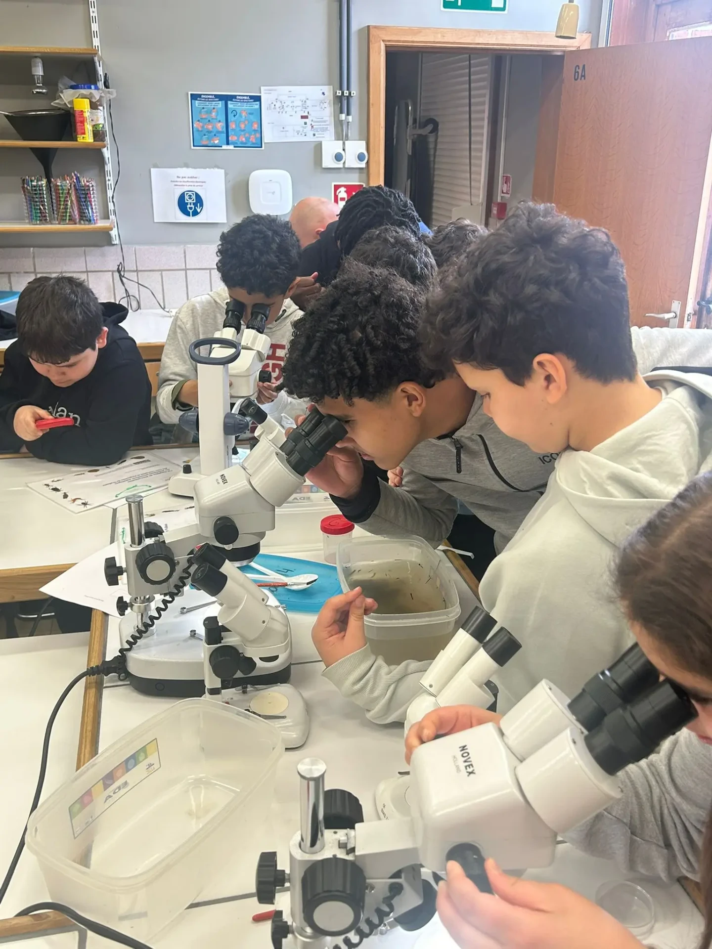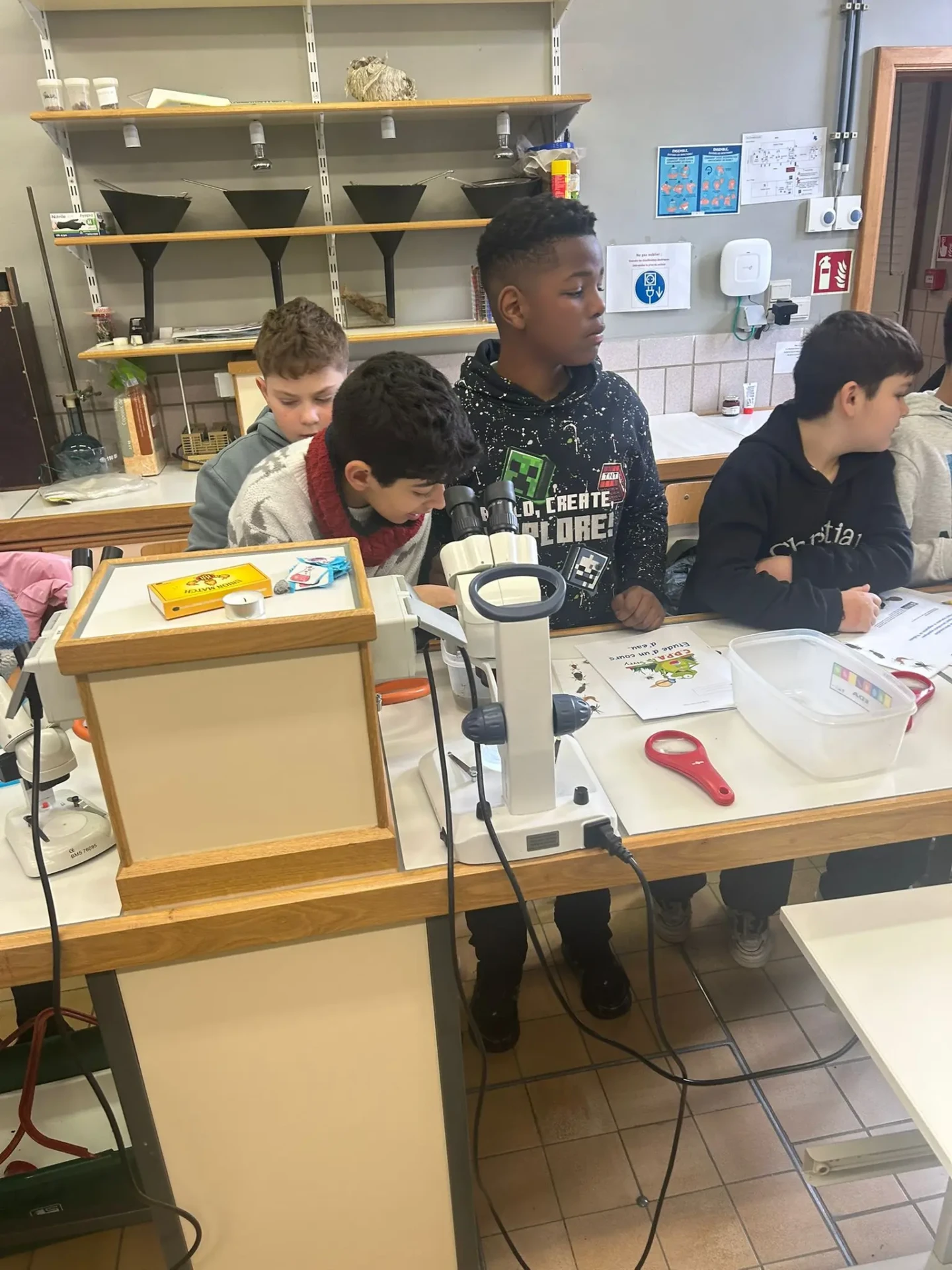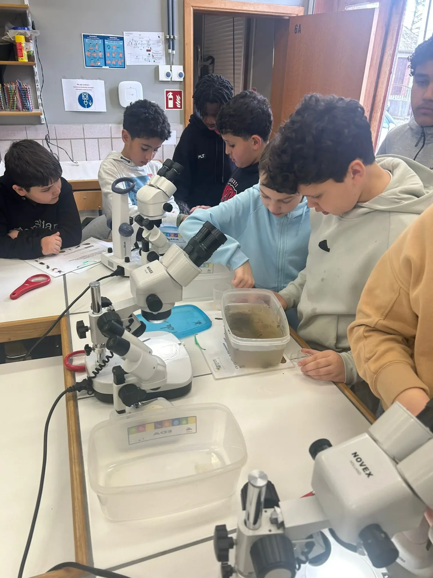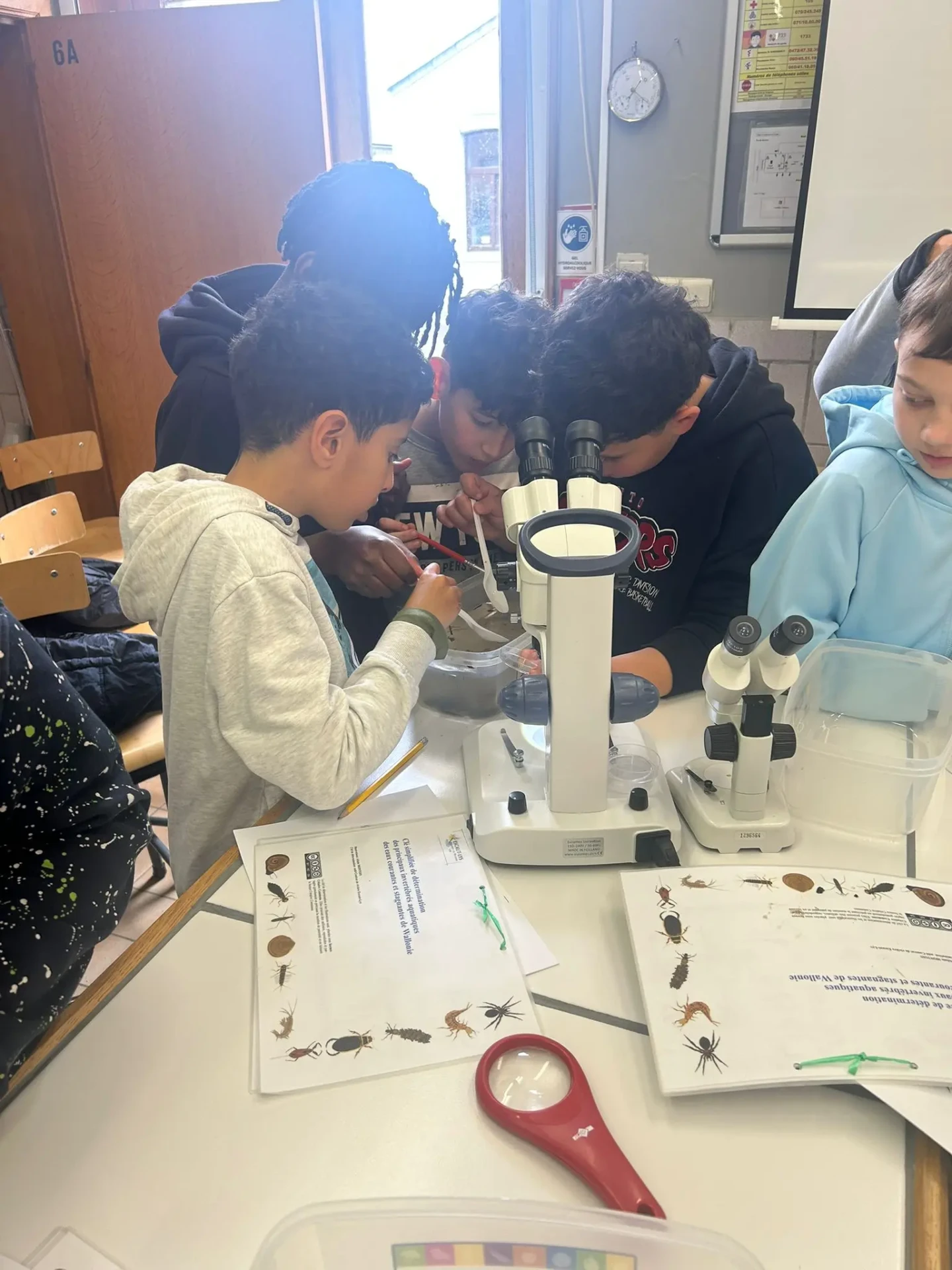 Aujourd’hui, nous avons profité des premiers rayons de soleil. Les enfants de P5 ont eu une formation à l’électricité et sont allés découvrir, à leur tour, les Fondry des Chiens et le musée du marbre. Les élèves de P6 quant à eux ont recueilli dans le ruisseau diverses espèces animales qu’ils ont ensuite observées au binoculaire et classées. Pour terminer la journée, un Grand jeu de Loup-garou.