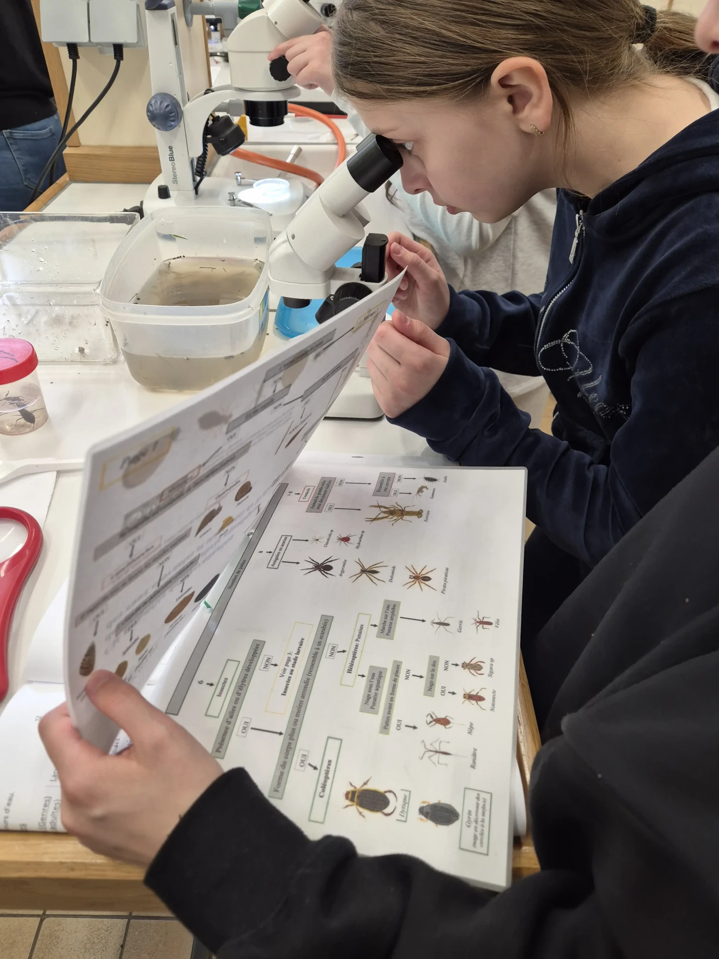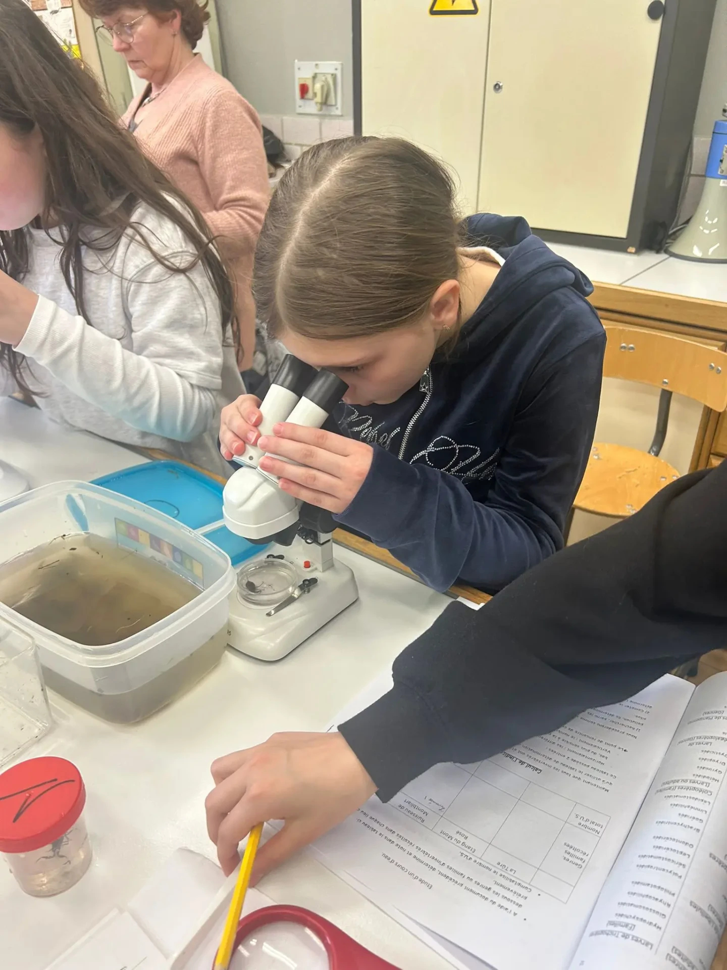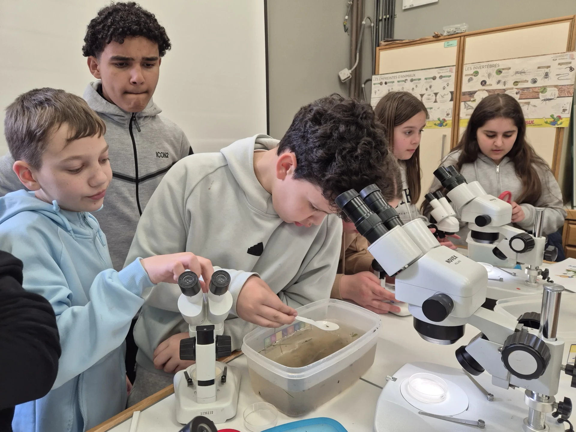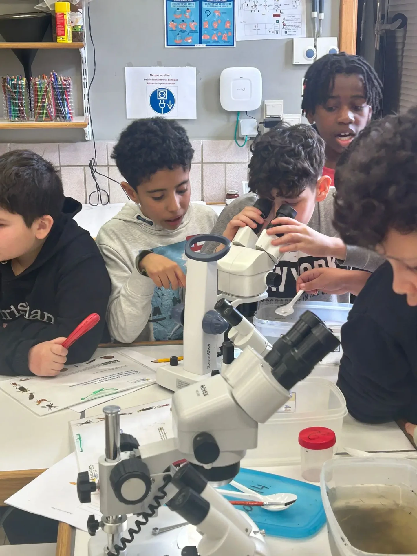 Aujourd’hui, nous avons profité des premiers rayons de soleil. Les enfants de P5 ont eu une formation à l’électricité et sont allés découvrir, à leur tour, les Fondry des Chiens et le musée du marbre. Les élèves de P6 quant à eux ont recueilli dans le ruisseau diverses espèces animales qu’ils ont ensuite observées au binoculaire et classées. Pour terminer la journée, un Grand jeu de Loup-garou.