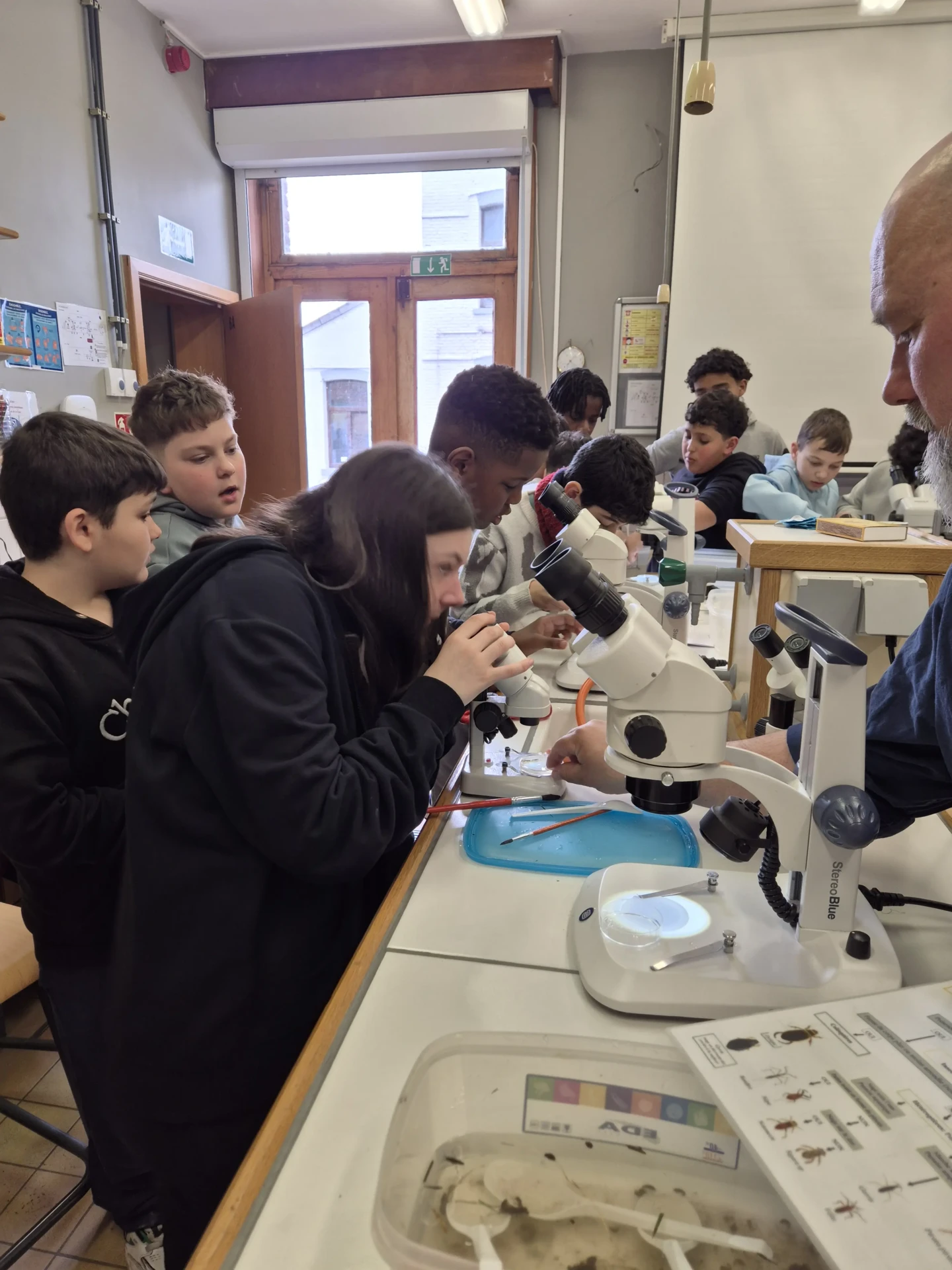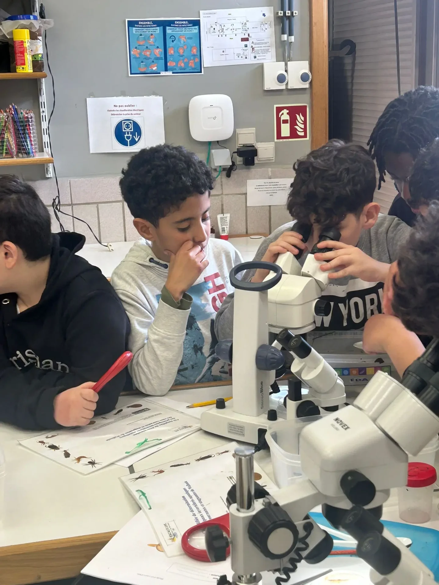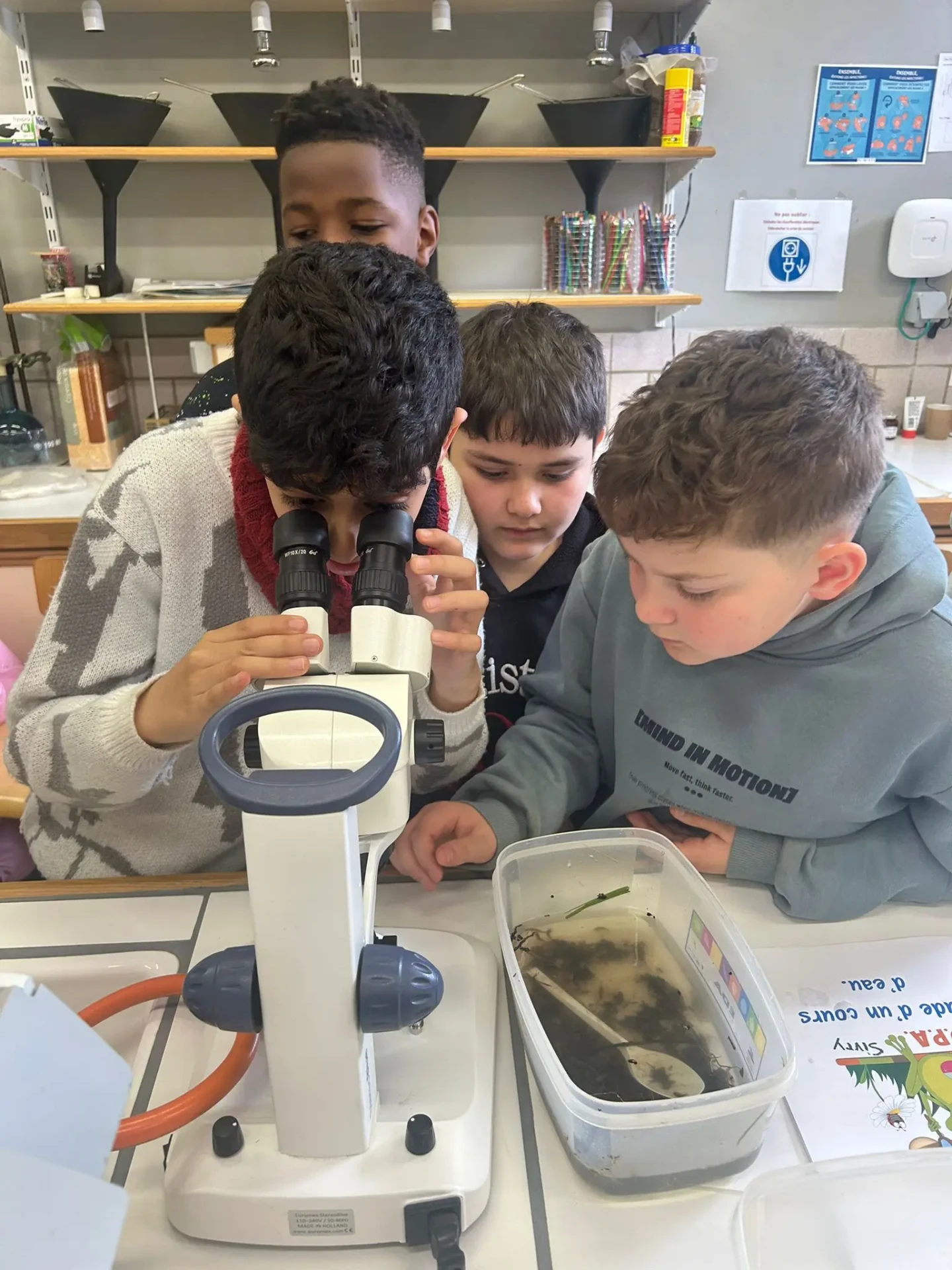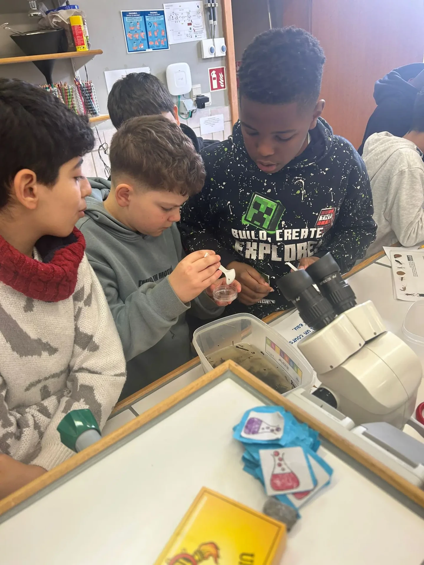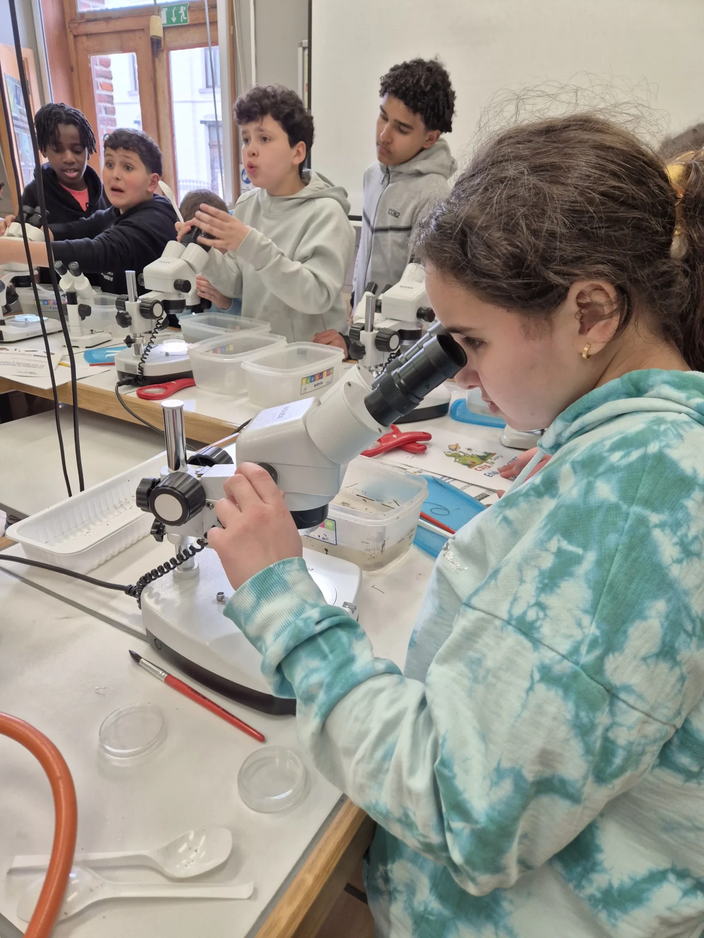 Aujourd’hui, nous avons profité des premiers rayons de soleil. Les enfants de P5 ont eu une formation à l’électricité et sont allés découvrir, à leur tour, les Fondry des Chiens et le musée du marbre. Les élèves de P6 quant à eux ont recueilli dans le ruisseau diverses espèces animales qu’ils ont ensuite observées au binoculaire et classées. Pour terminer la journée, un Grand jeu de Loup-garou.
