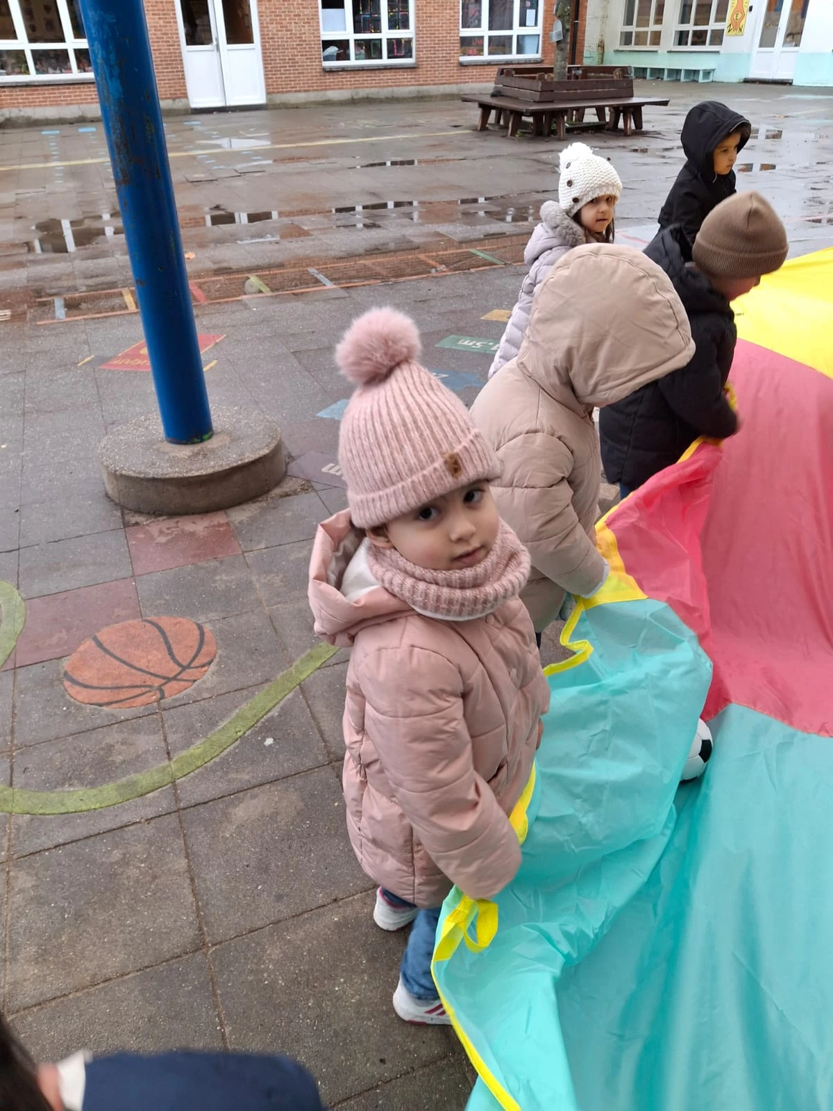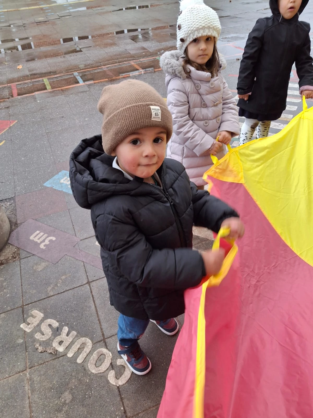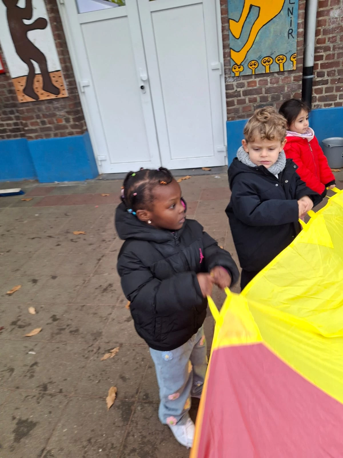 Ce mercredi, les classes des Chouettes et des Souris ont partagé un joli moment en extérieur autour du parachute.