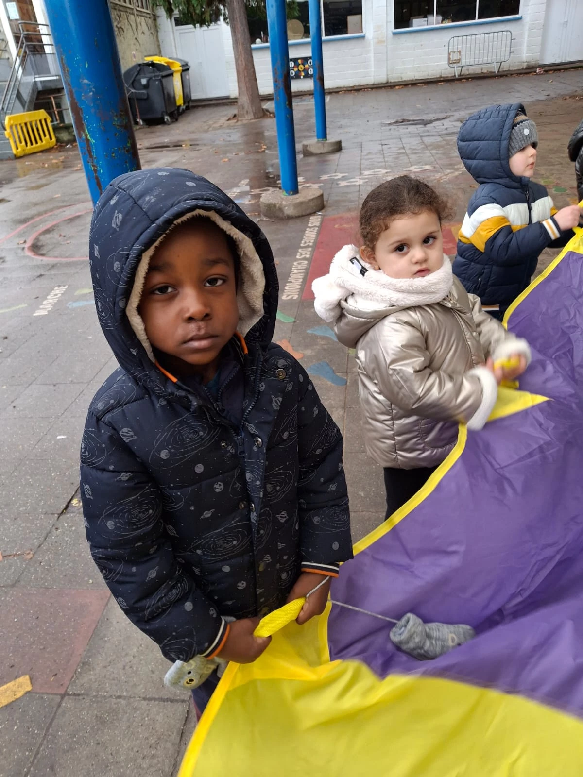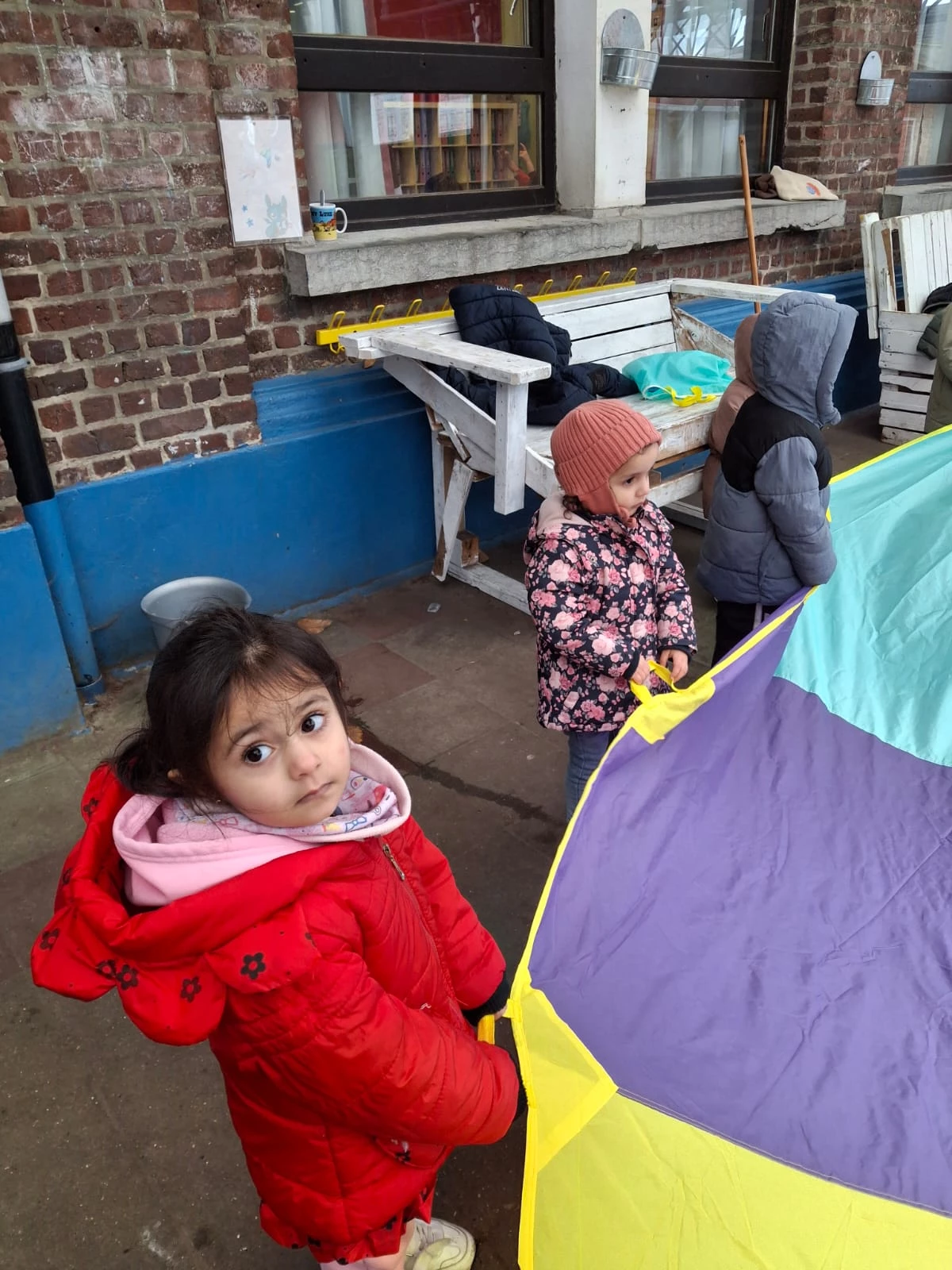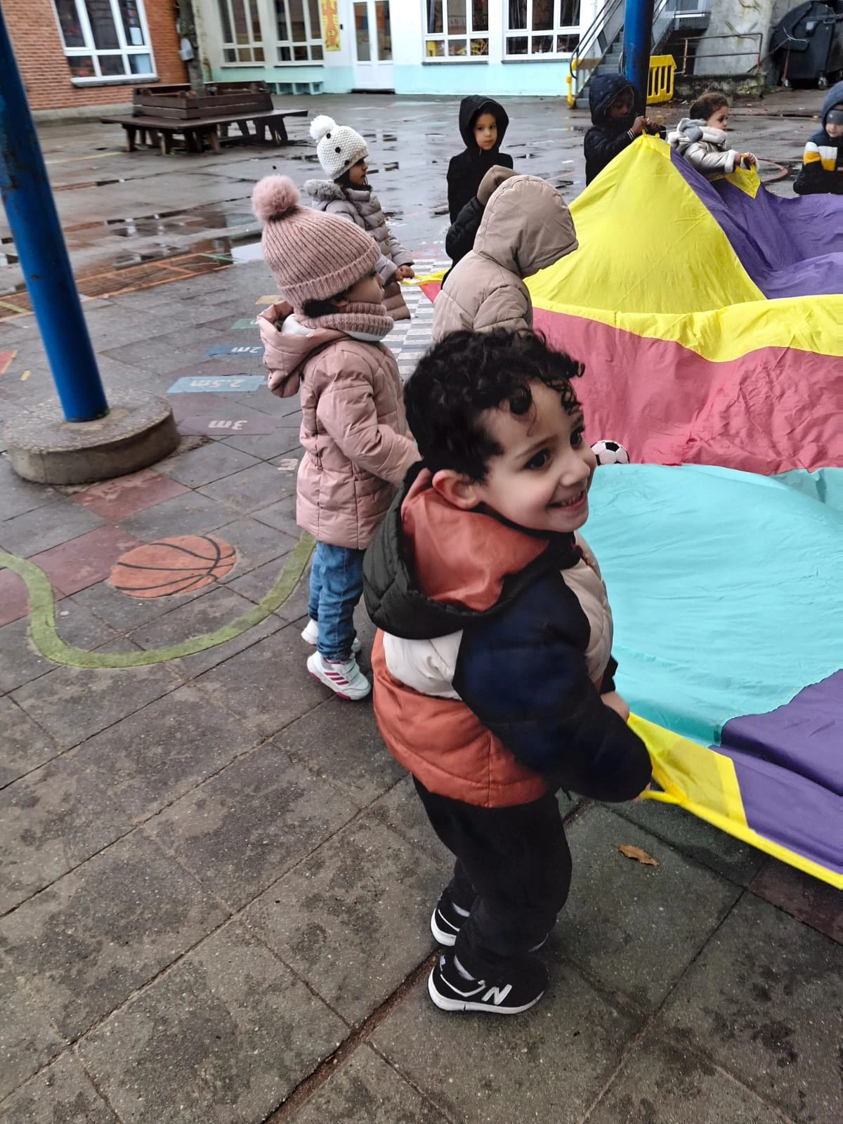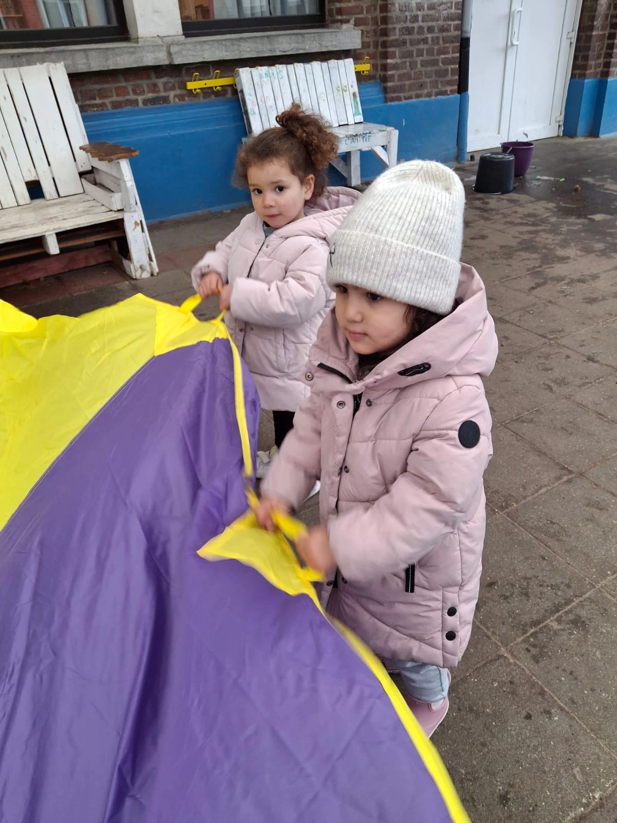 Ce mercredi, les classes des Chouettes et des Souris ont partagé un joli moment en extérieur autour du parachute.